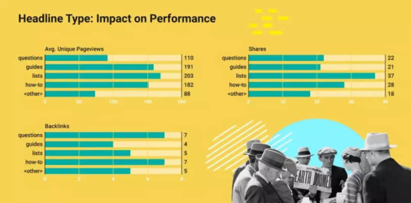 至關重要結果:與短題目(7-10個英語單詞)對比,長H1題目(14個英語單詞上下)的文章內容均值會得到:2倍的總流量、2倍的共享、5倍的反鏈。