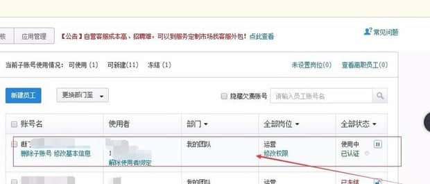 - 員工信息新建之后,就可在子賬號中心,員工管理中查詢,需要注意的新建的賬號,需要進行認證才可用;